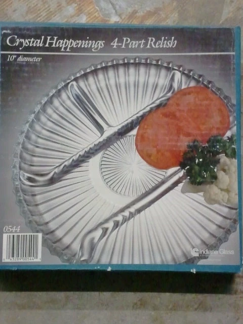 Vintage 1940’s Indiana Crystal 4 Part Relish Plate. Versatile as a relish dish or divided serving platter would look wonderful serving your veggies, fruit, desserts, appetizers or whatever else you desire. Measuring 10″ in diameter, it has plenty of capacity to serve up your goodies in style. A great addition to your Glass/ Indiana Collection!