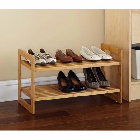 Mainstays 2-Tier Shoe Shelf will help streamline you and your family’s daily routine, and take the guesswork out of dressing. This ingenious little piece of furniture will help you minimize time searching for your favorite pair of footwear and never loose a lone shoe again. This wood shoe shelf can be stowed in your mudroom or coat closet to help reduce mud and dirt that shoes inevitably drag indoors. Place it at the bottom of your clothing closet to expand your storage area.ย
