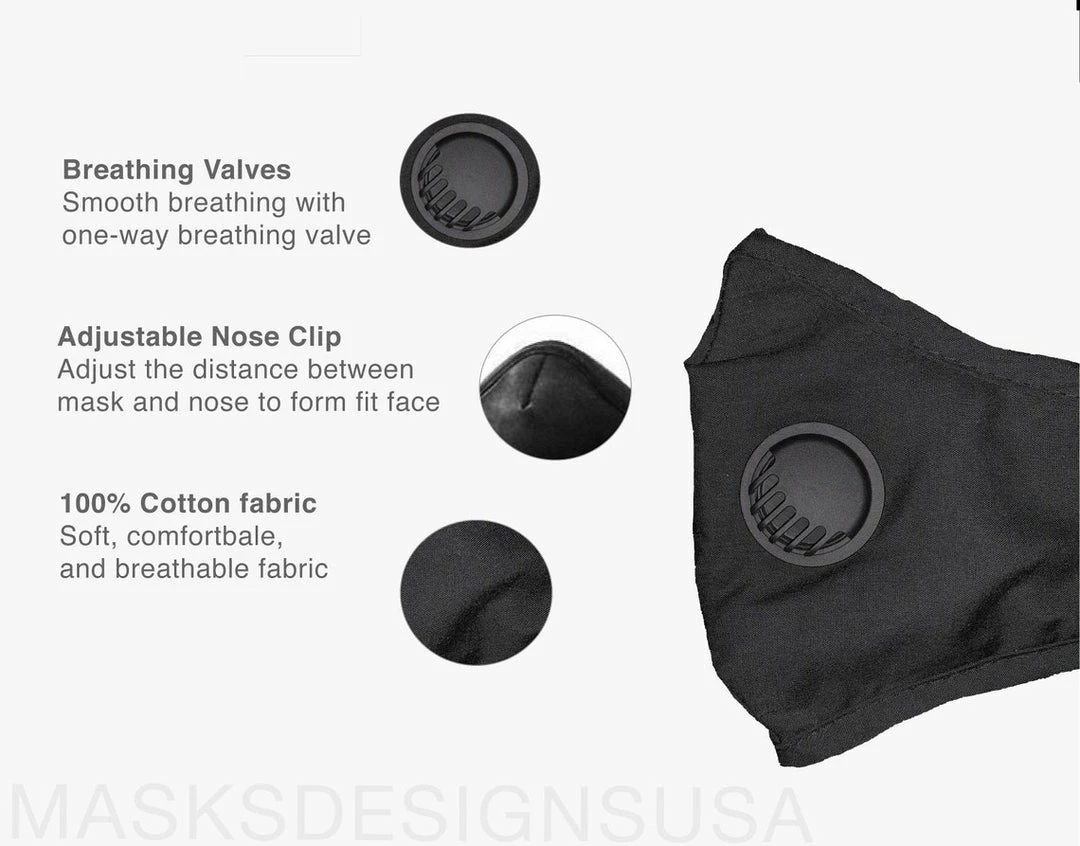 Face mask is washable and made of cotton with breathing vent and filter pocket. Unisex with adjustable nose clip.